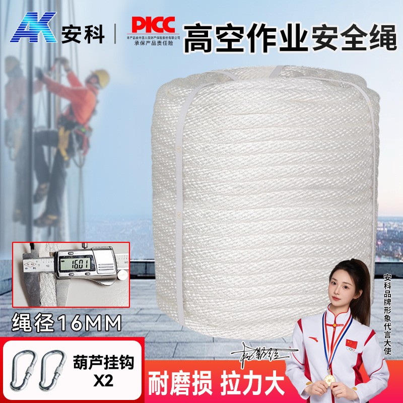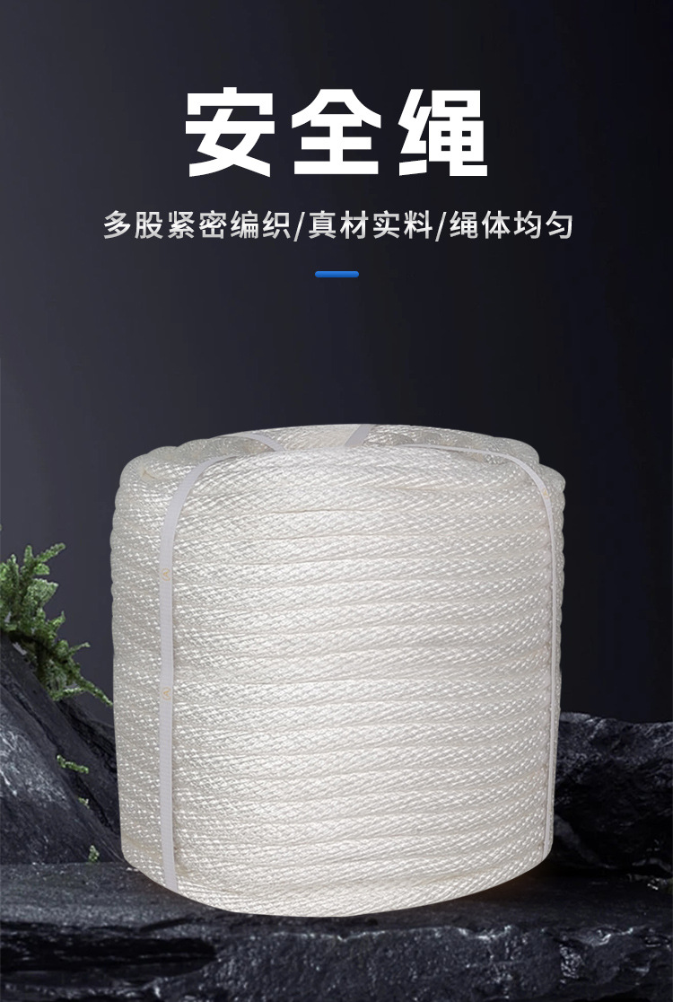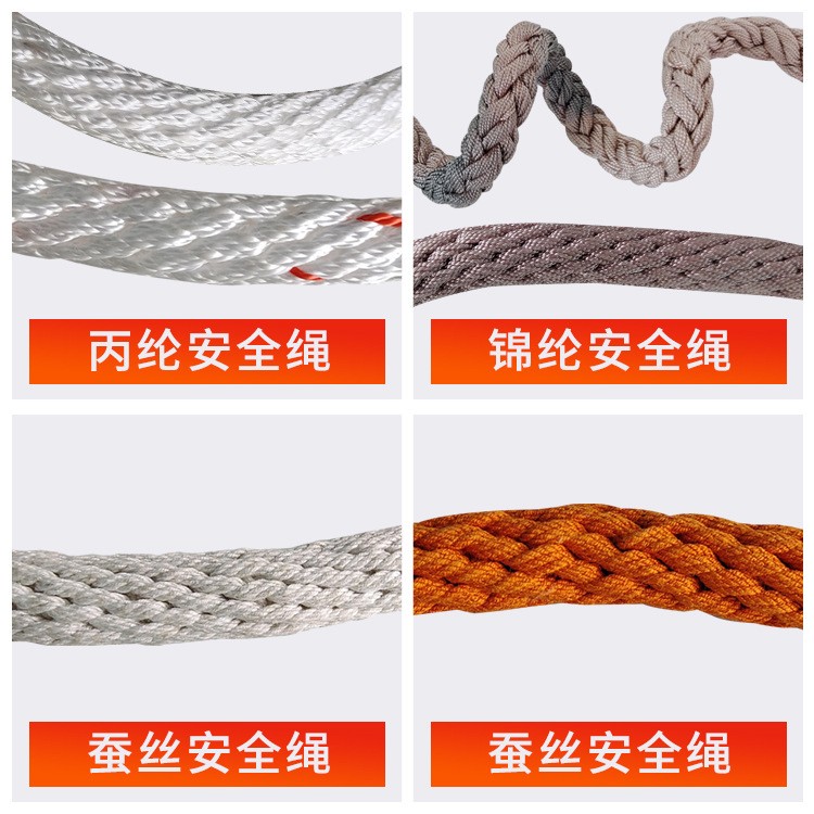 3、消防安全绳,用于高楼逃生。有编织和绞制两种,要求结实,轻便,外表美观绳子直径在14mm-16mm,一头带扣,带保险卡锁。拉力强度达到标准。长度根据用户需求定制。广泛用于现代高层,小高层建筑住户。4、外墙清洗绳,分主绳和副绳。主绳用与悬挂清洗坐板,副绳也就是辅助绳用于防止意外坠落,主绳直径18mm-20mm,要求绳子结实,不松捻,拉力强度高。副绳直径14mm-18mm,标准与其它安全绳标准相同。