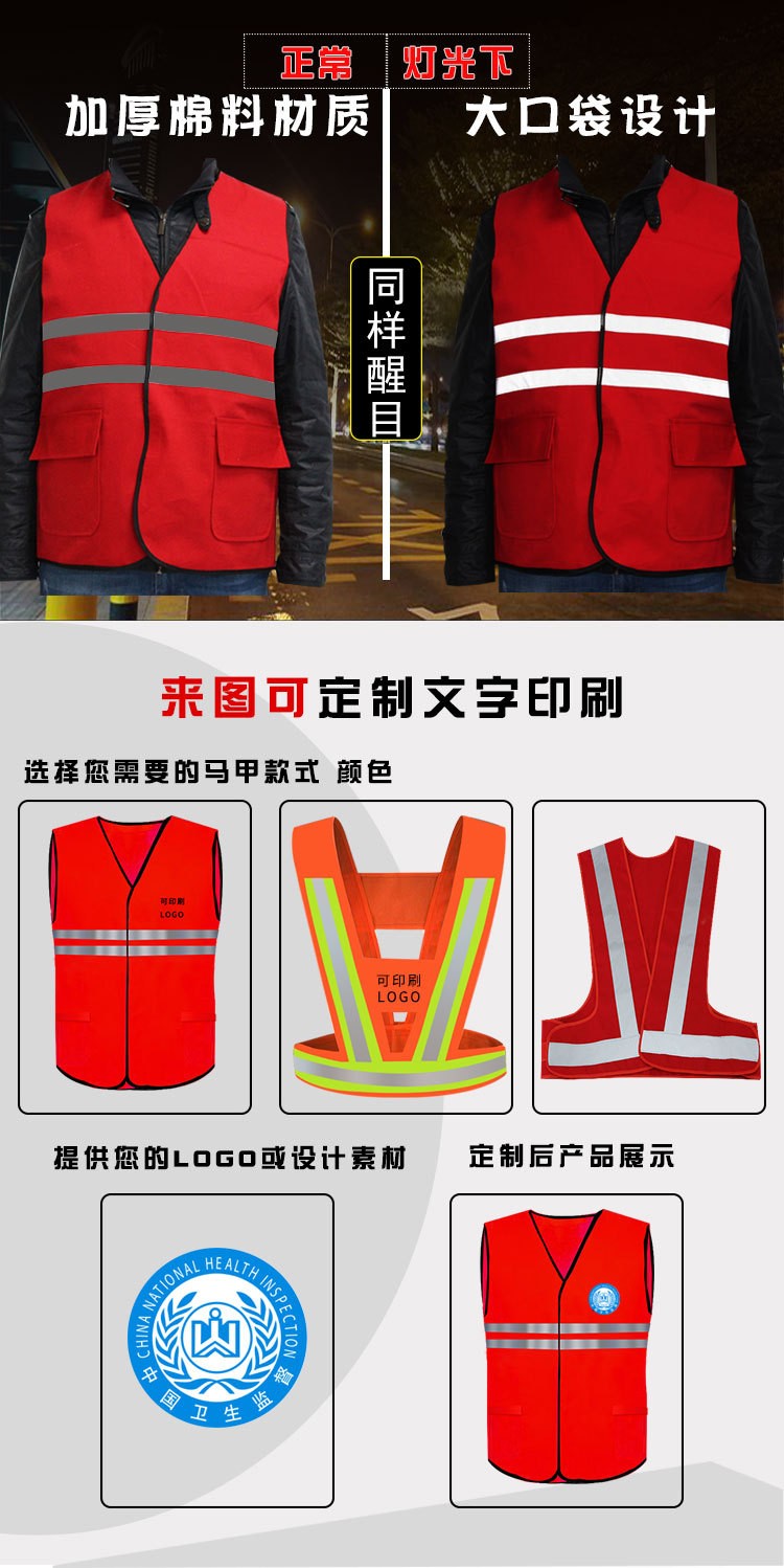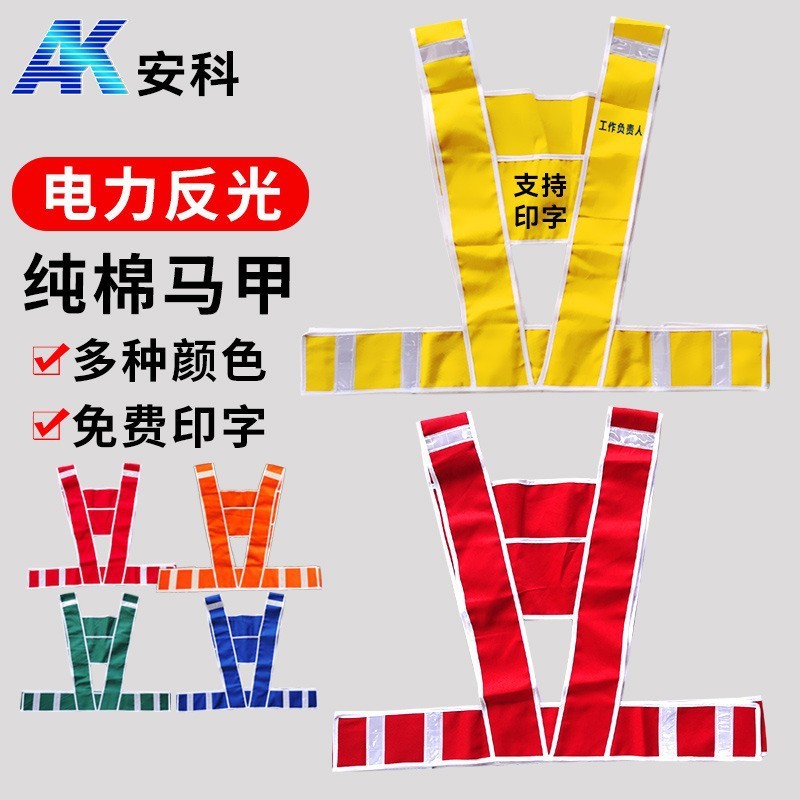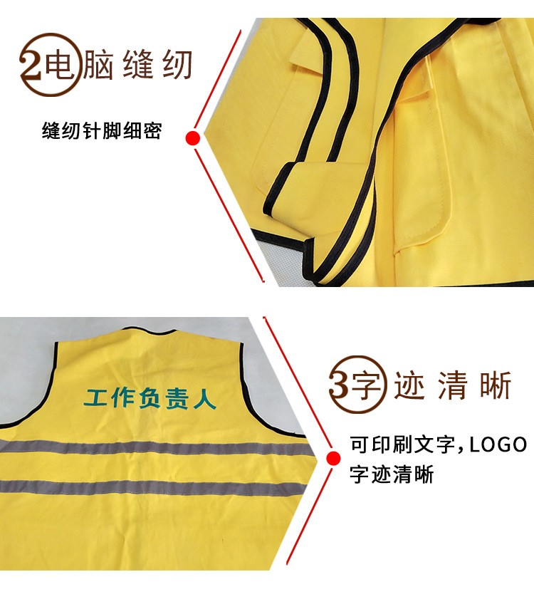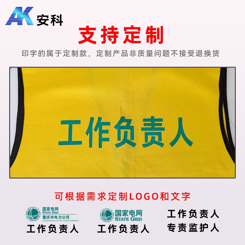 正面绣有:电网标示【也可南方电网或大唐、华能电厂等】,背面可根据需要绣制或印制各种工作如:安全员、专责监护、工作负责人等,颜色分为红马甲、黄马甲、蓝马甲,样式方便穿着。