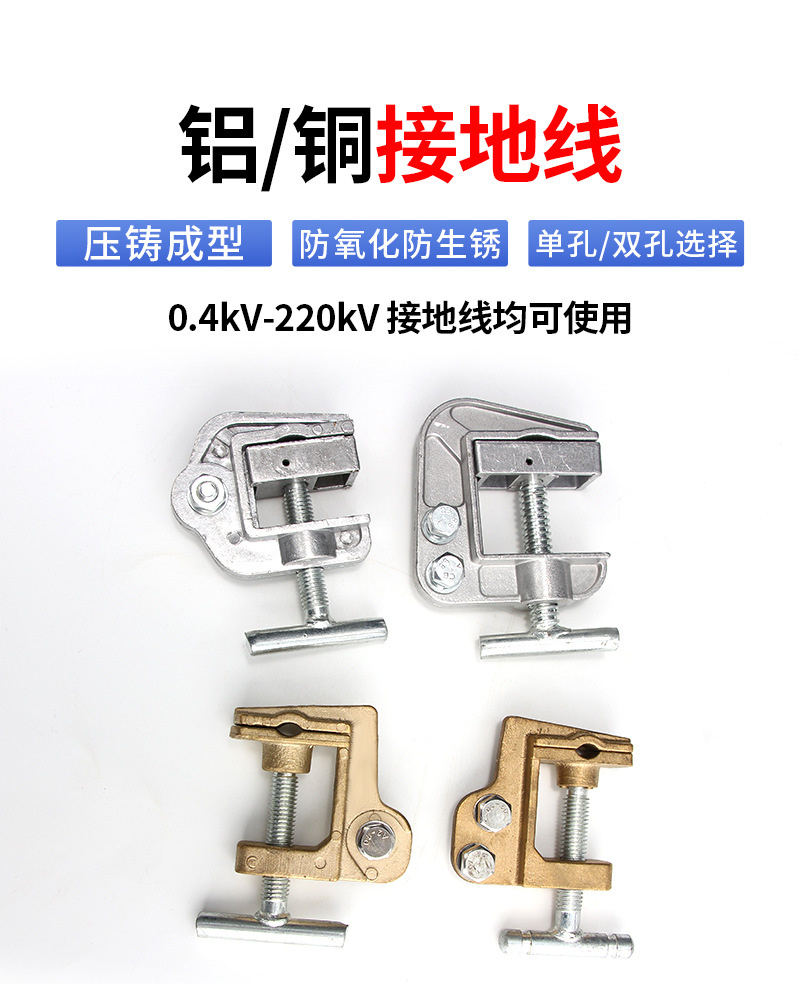 接地线夹是用在高压接地线的接地端使用的,该产品分为单孔接地线夹和双孔接地线夹,接地针,接地钉;接地线夹一般采用铝制、铜质材质;接地针一般采用铝制。
